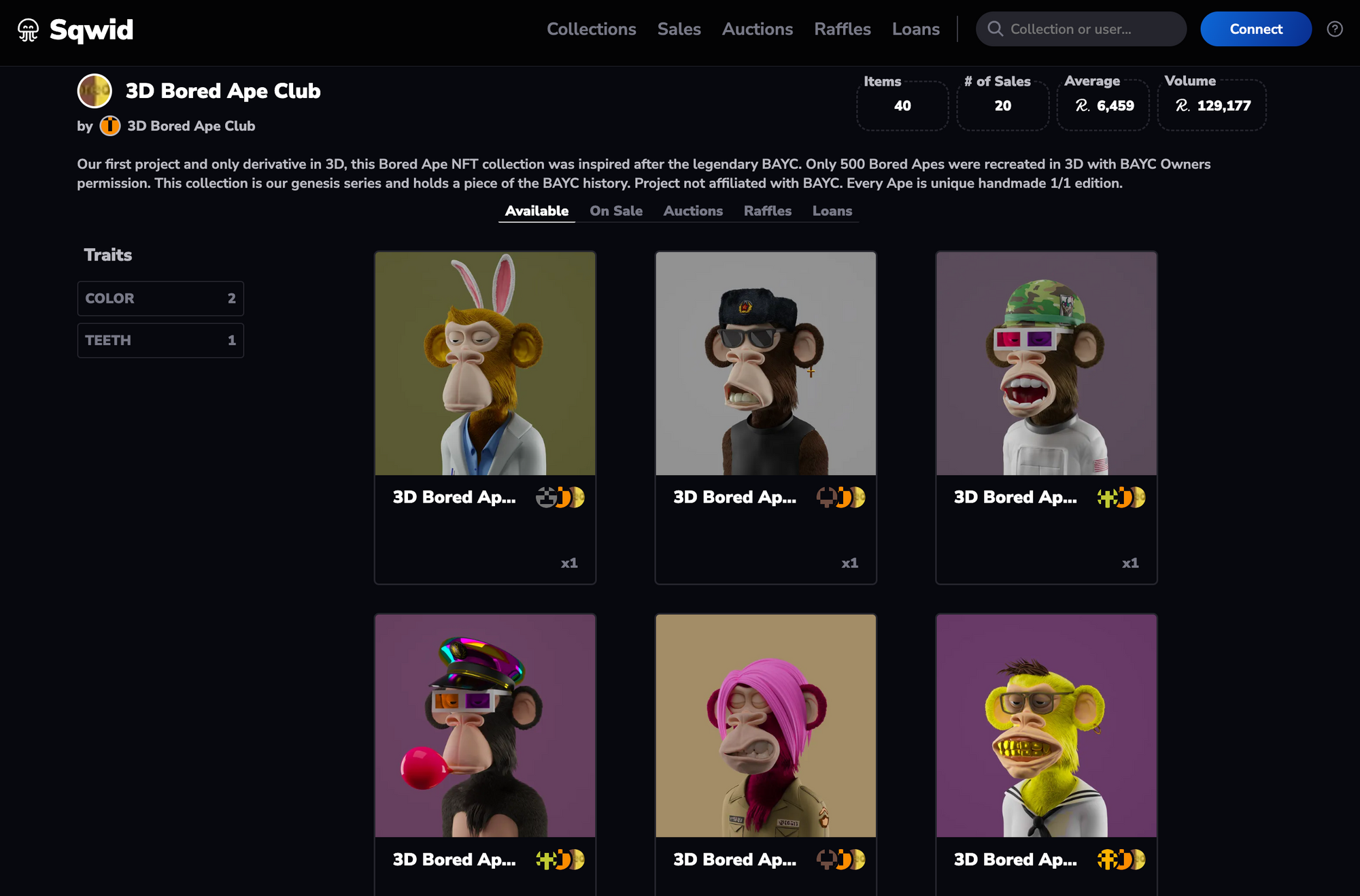 When it comes to sales volume, the 3D Bored Ape Club stands out once again with an impressive 129.1k in transactions. The community's enthusiasm for these unique NFTs has driven their popularity to new heights. Following closely behind is Dab Verse NFT's, with a notable sales volume of 89.5k. These collections are fueling the vibrant ecosystem of Sqwid App.