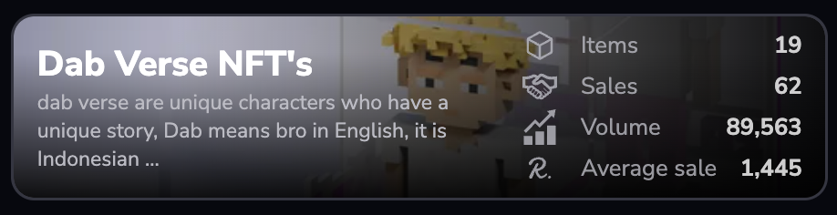 Coming in at a close second, Dab Verse NFT's showcase 62 successful NFT sales on Sqwid. Renowned for their vibrant and expressive designs, this collection has captured the attention of art enthusiasts. With an average sale price of 1.4k $REEF, these NFTs provide a gateway to a world filled with color and emotion.